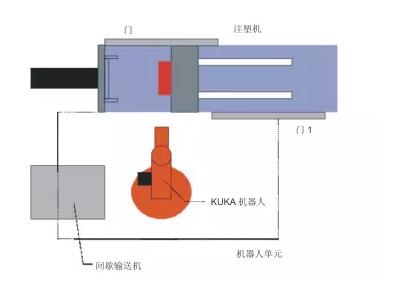 機(jī)器人的任務(wù)是將塑料制品從一臺注塑機(jī)中取出。制品用真空吸盤吸住,再堆放到注塑機(jī)旁的一臺間歇輸送機(jī)上